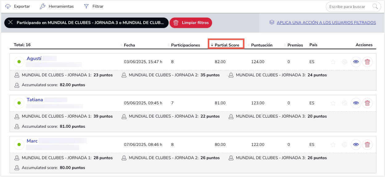 Una vez seleccionadas las etapas, hacemos clic en APLICAR FILTROS para añadirlo al gestor de usuarios. Podremos visualizar la información de puntuación de cada etapa de los usuarios, además de la nueva información de la puntuación parcial: