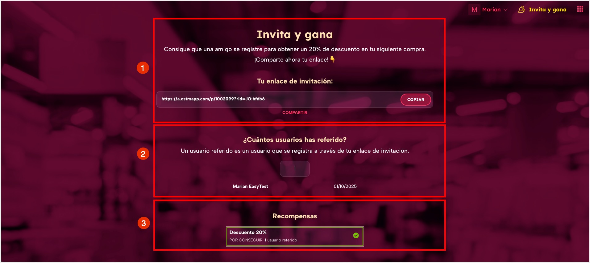 Al crear la promoción, se habilita automáticamente una nueva sección: la pantalla "Invita y gana". Se trata de una página privada donde cada participante puede ver: