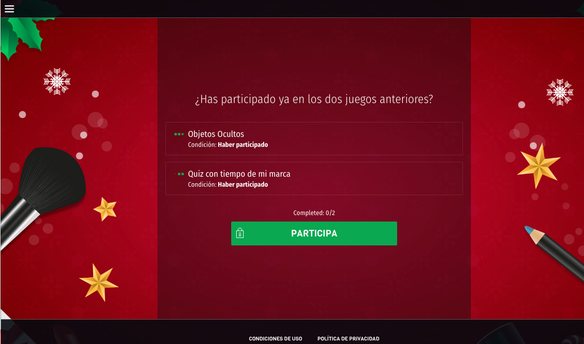 En promociones con múltiples etapas (Aplicaciones de multijuegos, multi-quinielas, calendario de adviento, programa de fidelidad, escape room...) ya era posible pedir al usuario uno de los tres siguientes requisitos para poder participar en una etapa en concreto de la promoción: