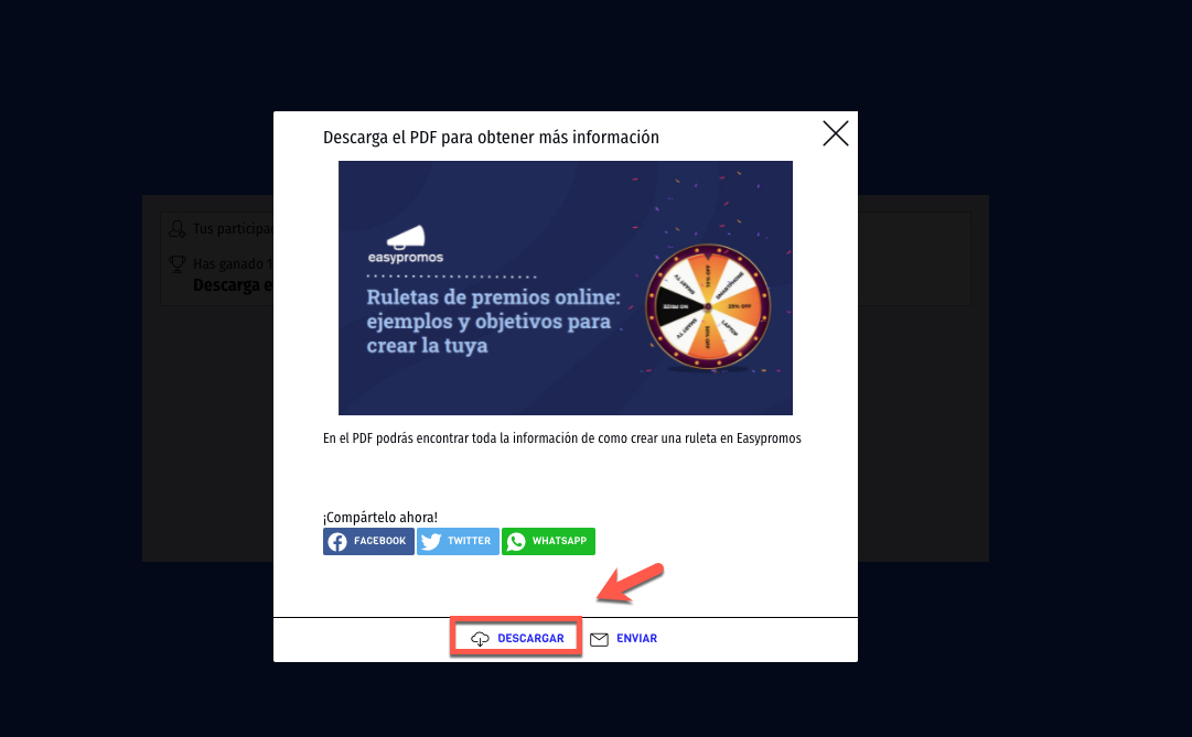 Una vez que el usuario haga clic en el botón, aparecerá el pop-up del premio configurado, con el PDF asignado al premio para que pueda descargarlo:
