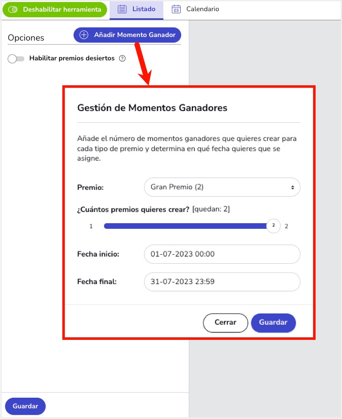 Una vez creado el premio, desde el apartado Editor > Herramientas > Momento ganador podrás definir la fecha y hora de asignación de cada uno de los premios por Momento ganador.