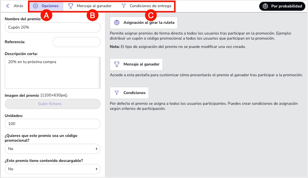 Desde el apartado Editor > General > Premios podrás crear los premios por Probabilidad: