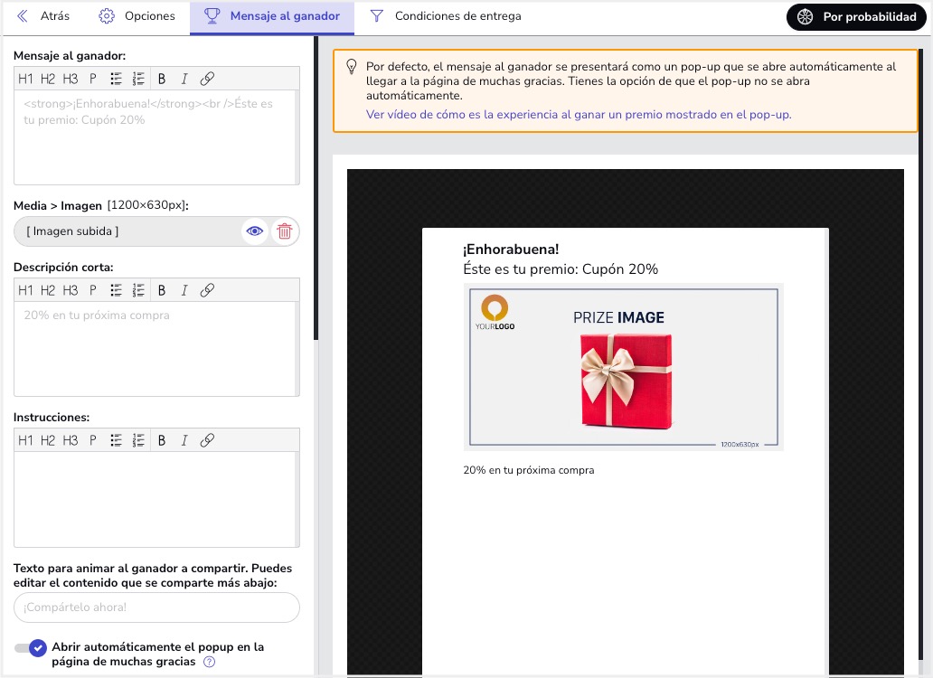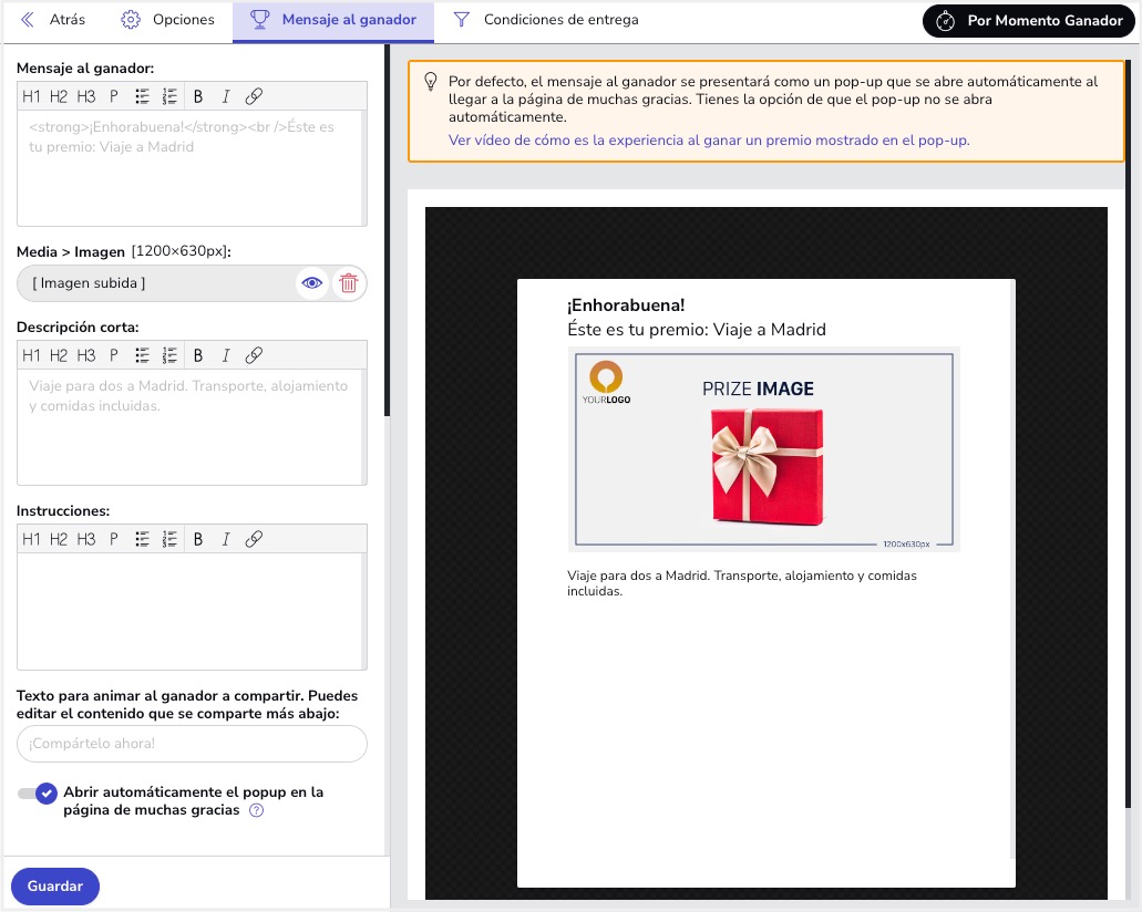 B. Pestaña "Mensaje al ganador": Esta pestaña presenta todas las opciones para personalizar el diseño y la forma de presentar el mensaje a los usuarios que resulten ganadores del premio. En concreto, podrás subir una imagen y configurar el mensaje que verán los ganadores.