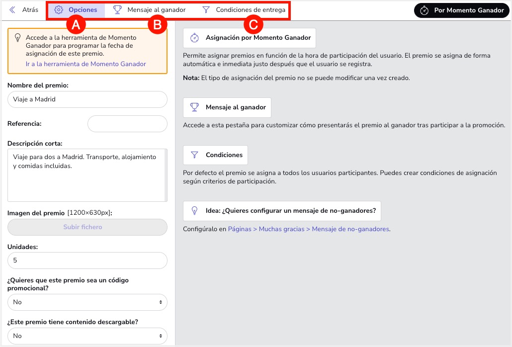 Nota: Los premios por Momento ganador tienen prioridad respecto a los premios por Probabilidad. Esto quiere decir que si hay una unidad de premio por Momento ganador disponible, éste siempre se asignará antes que un premio por probabilidad.