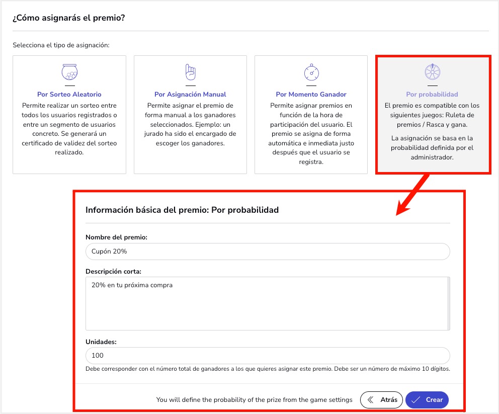 - Premios del tipo “Probabilidad”: Estos son premios que se asignan en función de las probabilidades definidas por el organizador.
