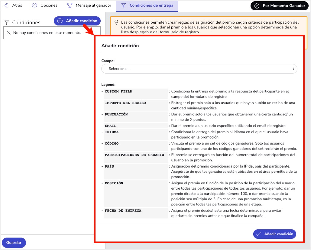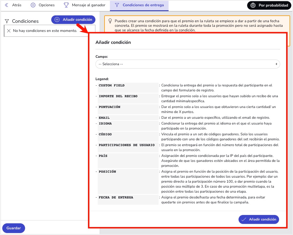 C. Pestaña "Condiciones de entrega": Por defecto, el premio se asigna a todos los usuarios participantes. Desde esta pestaña puedes crear una condición para que el premio salga al descubrir los elementos ganadores a partir de una fecha concreta.