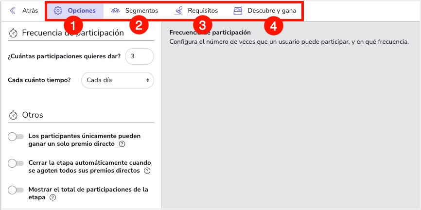 1. Opciones: Contiene las opciones generales de la etapa. Desde este apartado podrás configurar el número de veces que los usuarios podrán jugar y descubrir los elementos, así como la frecuencia de participación que se les otorga a los usuarios.