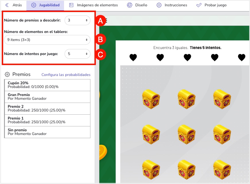 C. Número de intentos por juego: Puedes personalizar la cantidad de elementos que los usuarios pueden descubrir. La cantidad de intentos dependerá de la cantidad de elementos que se muestran en el tablero y de cuántos elementos ganadores se requieren para obtener un premio (1 o 3).