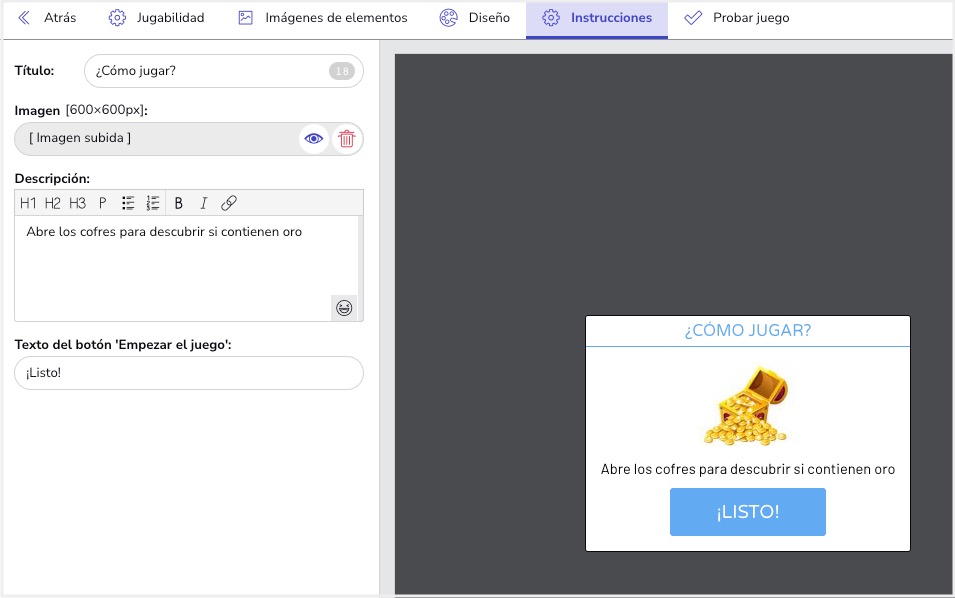 Podrás personalizar el tablero del juego, con sus elementos que deberán descrubrir los usuarios. Puedes definir cuántas veces puede participar un usuario, por ejemplo, 3 veces en total o una vez al día. También tienes opciones avanzadas como limitar la participación a quienes tienen un código válido o un ticket de compra.