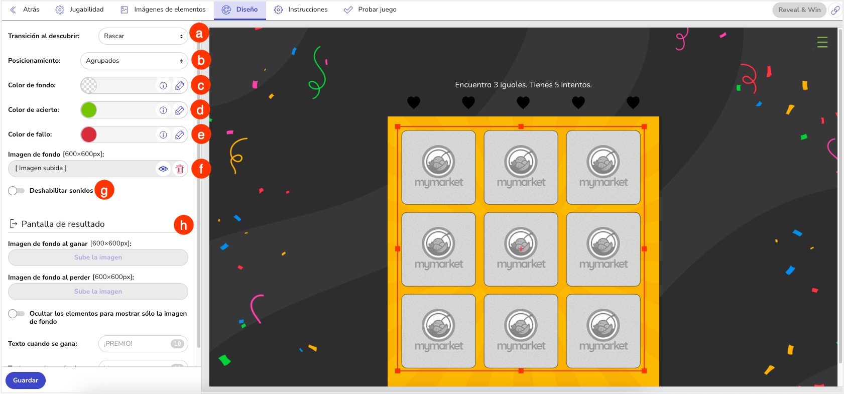 4. Diseño. En esta pestaña, encontrarás todas las opciones para personalizar la tarjeta de juego:
