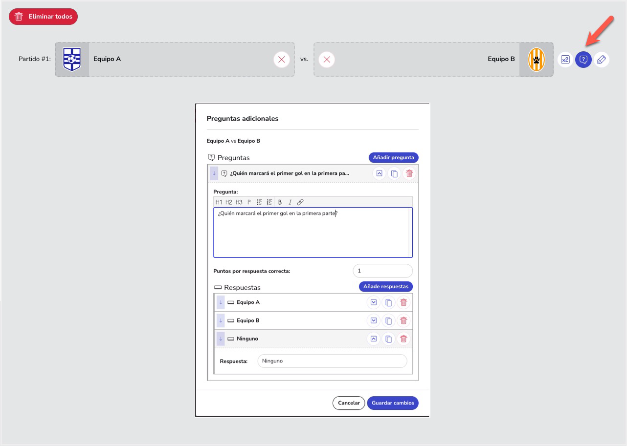 Esta nueva opción te permitirá añadir preguntas adicionales en cada uno de los partidos configurados. Con esta opción podrás dar puntos adicionales, independientes de la respuesta del usuario en el resultado del partido.