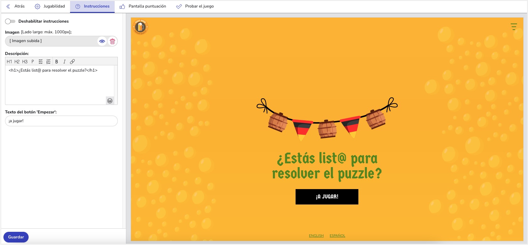 En la pestaña "Instrucciones" podrás personalizar la pantalla que les aparecerá antes de empezar a jugar. Esta pantalla se puede personalizar con los siguientes elementos: