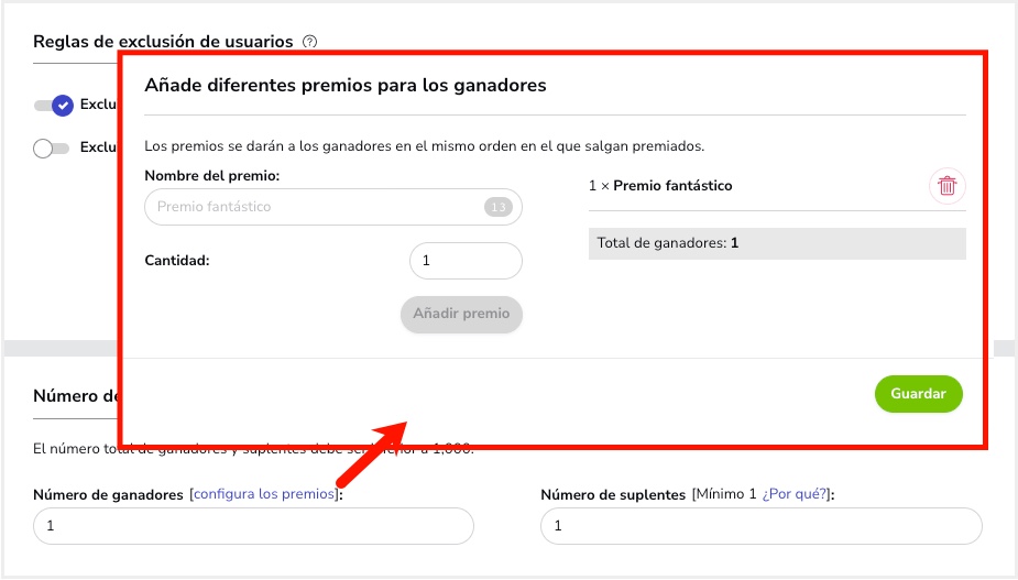 - Excluir usuarios que ya han ganado: Esta opción te permite evitar que un mismo usuario pueda ganar más de un sorteo de los diferentes sorteos que realices.