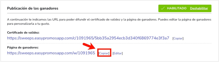 Cuando ya tengas a punto la página de ganadores, comunícala compartiéndola en redes sociales. Puedes utilizar el botón "Copiar" para difundir directamente la URL de la página de ganadores.